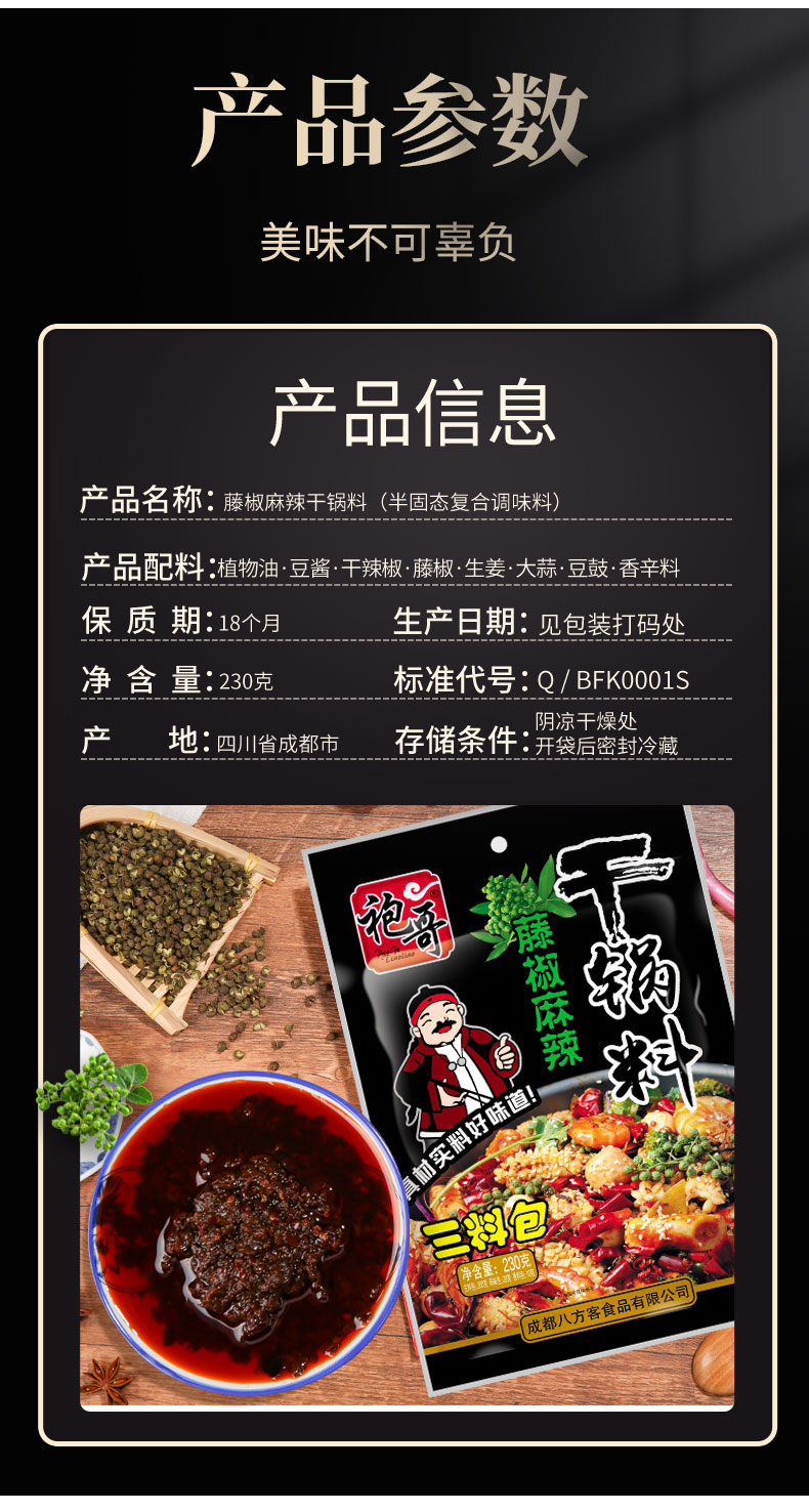 成都八方客食品有限公司经过多年的开拓创新,现主打品牌“袍哥”,主营产品有袍哥藤椒特麻鱼、袍哥藤椒酸菜鱼。品质上乘,色泽纯正,味道独特,是川渝调味品行业后起之秀。本着:”喜迎八方宾朋,共创川味精品“的经营理念,愿以高品质产品与新老客户建立长期密切的合作关系,共谋双赢大计。