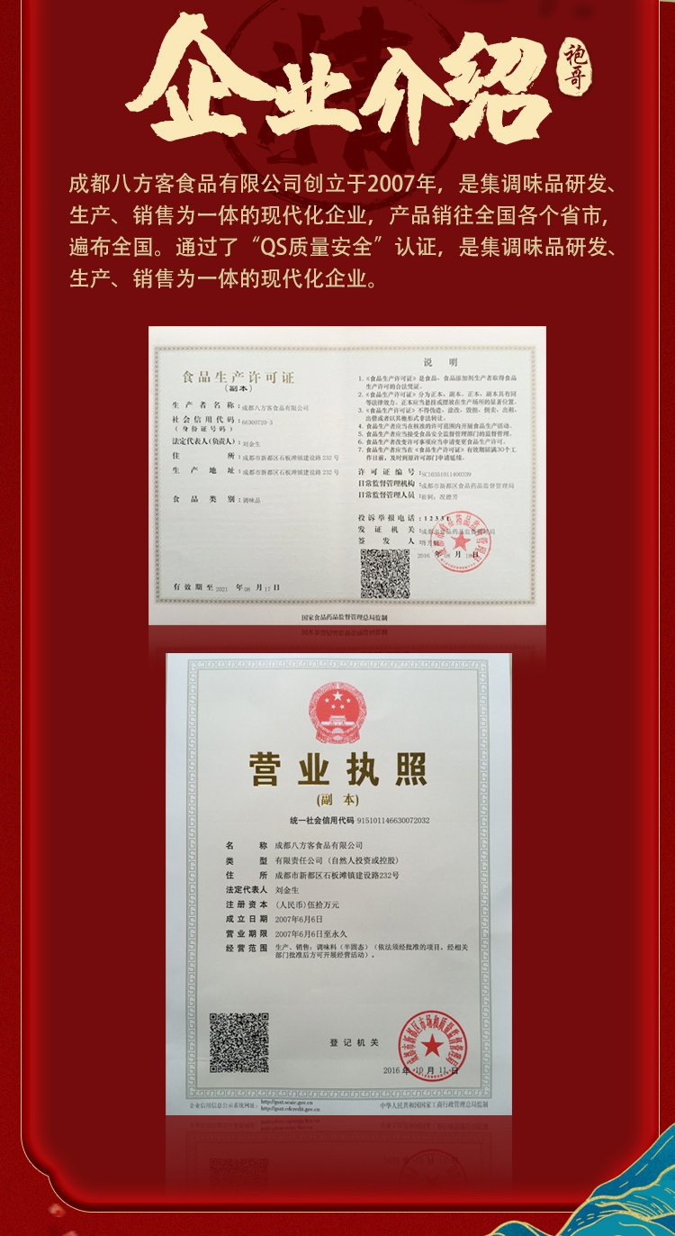 成都八方客食品有限公司经过多年的开拓创新,现主打品牌“袍哥”,主营产品有袍哥藤椒特麻鱼、袍哥藤椒酸菜鱼。品质上乘,色泽纯正,味道独特,是川渝调味品行业后起之秀。本着:”喜迎八方宾朋,共创川味精品“的经营理念,愿以高品质产品与新老客户建立长期密切的合作关系,共谋双赢大计。